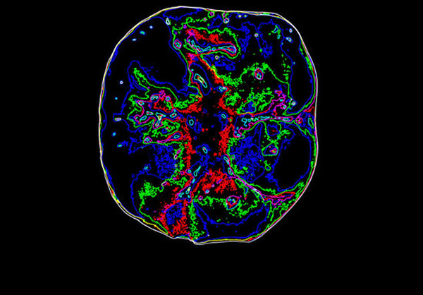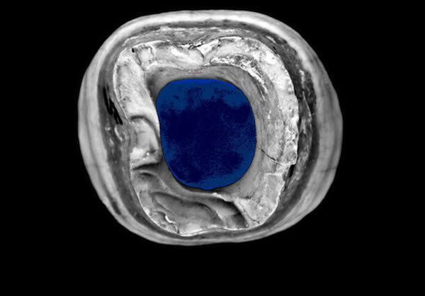 右下方第一颗臼齿的咬合视角,以不同的颜色突出了牙冠的形态学。