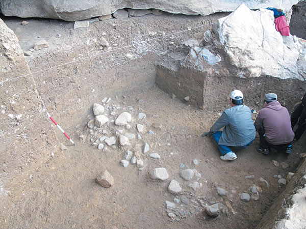 石铺地面3处:T1③B层下的石铺地面略呈圆形,边缘为黑、黄色黏土羼杂的火烧硬面,结构致密、坚硬;其西部有数块排列有序的大石块,似属人工有意放置。故该处应是洞内居民的聚集活动场所,其东北部有一烧火堆遗迹。T2⑦层的石铺地面,应为人工搬运河滩磨圆度较高的鹅卵石铺垫而成,间杂大量青灰色细砂,结构致密、坚硬。地面中间略高于两边,且南部边缘发现一排水沟。T5⑤层下石铺地面位于洞外北面2号无名洞洞口,往洞内延伸,揭露面积约5平方米,全部为河卵石铺就,面上填沙。