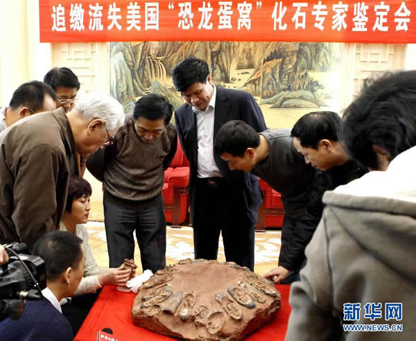 当日,国家古生物化石专家委员会、中国科学院古脊椎动物与古人类研究所7位专家对追缴流失美国“恐龙蛋窝”化石鉴定会在中国地质博物馆举行。专家认定这组恐龙蛋窝化石由22枚恐龙蛋组成,其中19枚破裂可见胚胎,3枚蛋壳完整,初步鉴定属长形蛋类,产地为江西赣州,时代为晚白垩纪。该恐龙蛋窝有人为痕迹,专家建议进行专题研究。