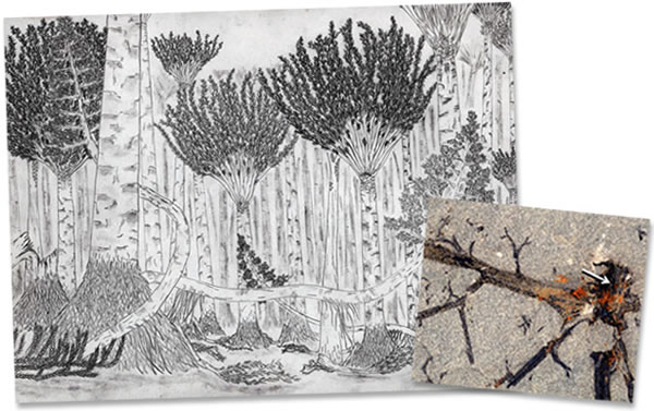 这片森林的新成员包括一种与树大小相似的石松,其主干直径为11厘米,至少有3.9米高,为此时代已知同类中最高的。另外一种是类似藤蔓的植物,多分枝的树茎从其木质的根中长出来(插图中箭头所指处为根的片段)。