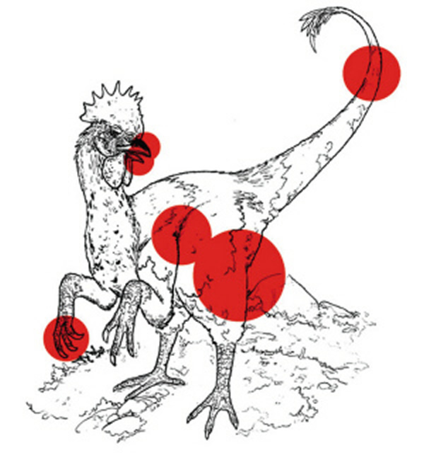 恐龙鸡模拟图,红点表示重点改进部位。