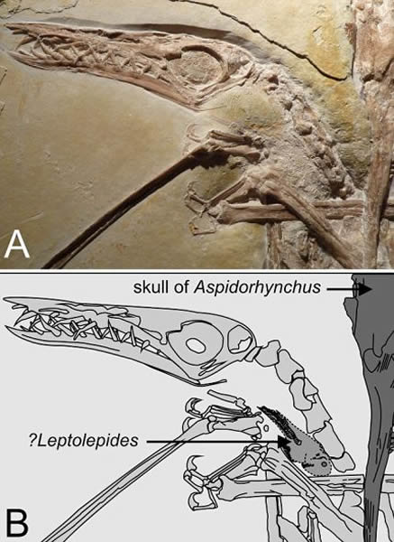 不可思议的是,科学家研究化石后发现,这只翼龙的喉咙里好像还有另一种体型较小的美鳞鱼。这或许意味着这只飞行爬行动物享用的美食,其实是抢的其他动物的食物。但科学家怀疑这种翼龙是不是这种身披甲壳的鱼类正常猎物的一部分,并指出剑鼻鱼可能攻击错了对象。