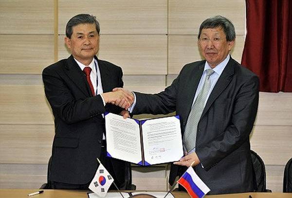 韩国克隆学家黄禹锡,在与俄罗斯东北联邦大学签署合作研究协议后绽放出笑容