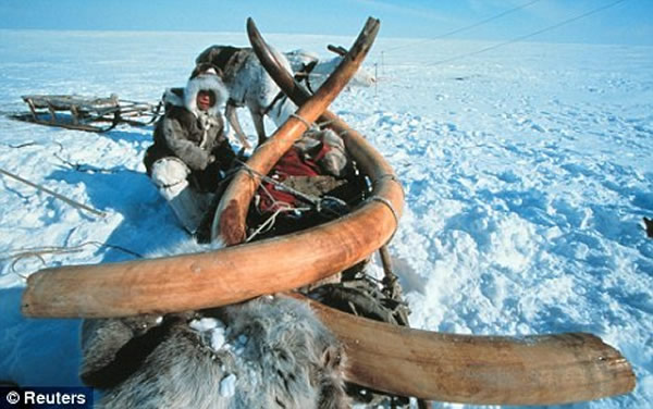 在西伯利亚永冻土中发现的猛犸象牙。1999年,考古学家在西伯利亚挖掘出一具完整的猛犸骨架,距今2.3万年