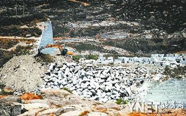 在采访中,一位60多岁的山村治保主任回忆起童年的光景:“10年前来这里玩,还有好多形象的石头,观音坐莲啊、领着四个孩子的夫妻石啊,还有海豚石、猩猩石,更有一串一串的火车石……”这位山民惋惜地说,如今,火车石彻底消失在了一片黄沙中,猩猩石、海豚石也都残缺不全了。观音坐莲的莲座就在不久前的晚上被挖掉了,而夫妻石还在,领着的四个孩子却丢了。官地村对面的几座山丘是由整块巨石构成,过去是一片绿色,如今看到的是一块被切割成“凹”字形的石山。
