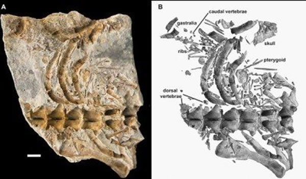 清晰的化石图像资料显示了部分成年的中龙化石骨架凌乱地堆砌其中,其中包括头骨、脊椎骨还是其他小中龙的骨骸。左图是一张化石特写图像,右边的则为由生物学家编辑后的图像,清楚地分离出各块骨头的分布位置。像这样的化石中夹杂着复杂的生物骨骼可在乌拉圭的一些地方找到,格拉谢拉·皮内罗和她的研究小组成员认为这些信息也反映出成年中龙具有照顾刚出生的幼小中龙的特点。本张图片的提供者为格拉谢拉·皮内罗(Graciela Piñeiro)。