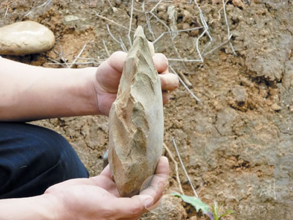 “这个好像是一件我们一直苦苦追寻多年的石斧!是加了工的石器。”两个人兴奋得手舞足蹈,这块石头长约20厘米,半截露在泥土外面,有点像半个梨子,一端略尖,一端略圆。上面还留着人工加工的痕迹。