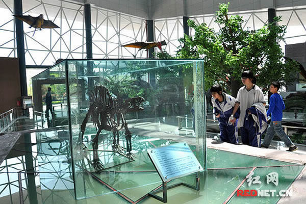 在这里,游客们可以通过一块块化石了解到寒武纪生命大爆发时的湖南和志留纪这片土地上的繁衍生息。更为值得一提的是,这里展出的于1981年在湘西桑植芙蓉桥地区发掘出来的无齿芙蓉龙属于槽齿类爬行动物,是恐龙、翼龙、鳄类及鸟类的共同祖先。这条龙长3.21m,高1.06m,是全世界仅有的三具骨架化石之一。