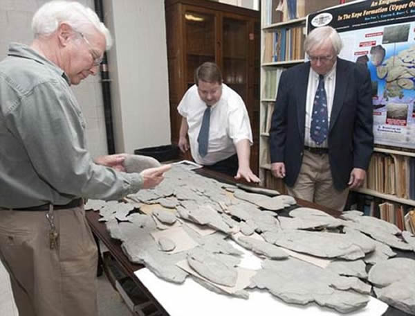专家迷惑不解,置疑这个庞大远古生物究竟是动物、植物还是一种矿物质,罗-费恩(图片中间)和地质学家大卫-迈耶(图片左侧)和卡尔-布雷特(图片右侧)正在研制这种神秘化石