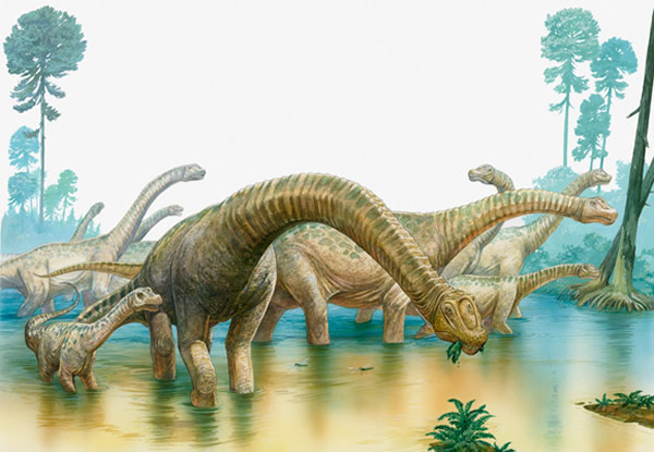 蜥脚类恐龙是一种以长长的脖子和巨大的体型而著称的食草动物,如上图中艺术家的重构图所示,它们是很多古代生态系统里的普通一员。此前的研究暗示,在草木丛生地区,每平方公里可能曾维持11到15只蜥脚类恐龙的生存,其总重量加起来超过了200公吨。利用现代肠道细菌的甲烷产量数据,研究人员估计,一年之中,全世界的蜥脚类恐龙会产生大约5.2亿公吨的温室气体。