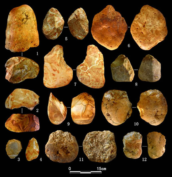 百色六怀山遗址周边新发现的石制品,图中1-2为石核,3-4为石片,5- 8为手镐,9—12为砍砸器。(徐欣、李锋供图)