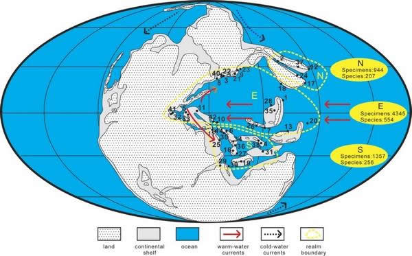 生物体个体大小与纬度的关系一直为现代生态学家所关注。早在1847年,Bergmann就提出温血动物的个体大小与纬度呈正相关,即温血动物在高纬度区个体会比低纬度区的大,这也被科学界称为Bergmann定律。近来年的研究证实很多鸟类、哺乳类、鱼类、头足类、腹足类等都遵循这个定律,但也有很多例外的情况,如现生海相双壳类的个体大小与纬度并无直接关系。然而,远古时期生物个体大小与纬度的关系却知之甚少,因为在国际上利用化石记录来研究此课题的工作才刚刚起步。
