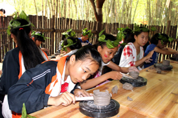 最为耗时的要属“原始制陶作坊”,体验者在这里可以亲手制作陶坯。在工作人员详细介绍了制陶方法后,学生各自动手“玩泥”制陶坯,大家充分发挥想象,纷纷制作造型独特的碗、杯子等器皿。据了解,这些制作的陶坯可以拿去烧制,也可作为纪念品带走。