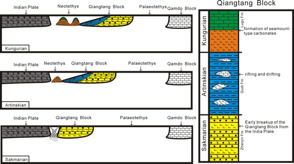 从区域上看,曲地组之下的擦蒙组和展金组中发育了大量的基性岩墙群,显示初始板内裂谷的环境。因此Artinskian期曲地组的浊积岩的形成被认为是其脱离冈瓦纳北缘的直接证据,而Kungurian期的海山型沉积被认为是来源于新形成的新特提斯洋。