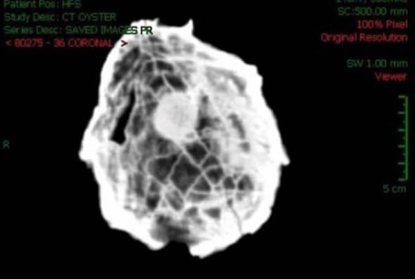 他们用医学磁共振扫描技术分析了这块珍贵化石,以便确认里面是否有一颗罕见的珍珠。结果表明,它里面确实含有一个和高尔夫球一般大的神秘光滑物体。如果把它从这个巨大牡蛎中取出,并确认是颗珍珠的话,它肯定会价值连城。但这样做必然破坏这块稀有的化石,所以专家不会深究这个神秘物体的真面目。