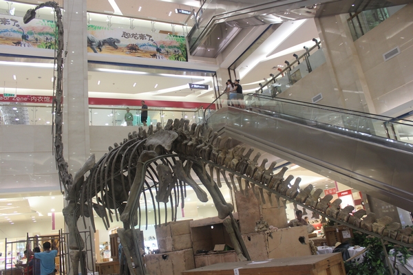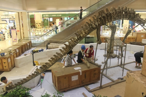 4日上午10点,记者来到了设计安放恐龙化石的步步高广场大中厅。在这里,十几个装载着恐龙化石的大箱子被分别放置在大厅的南侧和北侧。10点半,工作人员开始测量展台面积,在确定了布展范围并安置好警戒线后,开始定点安装展品底座。随后,来自四川自贡恐龙博物馆的专家开始为展台铺设防护地毯,并将支撑恐龙化石的金属钢架逐一拼接。由于体形巨大,直至当日下午6点,专家们只完成了天府峨眉龙四肢和尾部的化石拼接工作。