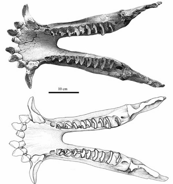 蒙古真恐角兽(Eudinoceras mongoliensis)下颌(IVPP V 18047)冠面(毛方园供图)