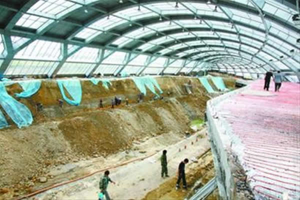 地质长廊总面积6341平方米。目前,潜龙造型的外表钢结构建筑已经完成,玻璃幕墙安装也已结束,正在进行地质剖面的挖掘。