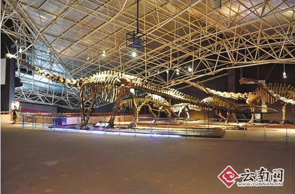 据介绍,目前“禄丰恐龙大遗址馆”共展出了40余件恐龙化石精品,70多具装架完成的恐龙模型。这里保存最多的是侏罗纪时期的恐龙化石,时间跨度大约有3600多万年,无论是恐龙化石的完整率、埋藏密度及种类、数量都堪称世界之最。在大遗址馆,记者还见到了一具堪称镇馆之宝的“许氏禄丰龙”,它的完整率高达98%。这条“许氏禄丰龙”由我国古生物专家杨钟健于1938年发现,禄丰也就是因为这条恐龙的发现而享有了“恐龙原乡”的美誉。“这条许氏禄丰龙发现的时候就是这样整具地趴着,长六米,高两米左右,”禹导游说:“恐龙的命名,一般由发现者名字结合发现地来命名,但这条许氏禄丰龙有点特殊。背后的故事是,中国的恐龙研究比欧洲晚100多年,当时又正值抗战,受到资金和技术的限制,杨钟健求助于他的德国籍老师,之后为了表示感激便用他恩师的中文姓氏来命名,于是便有了许氏禄丰龙这个名字。”