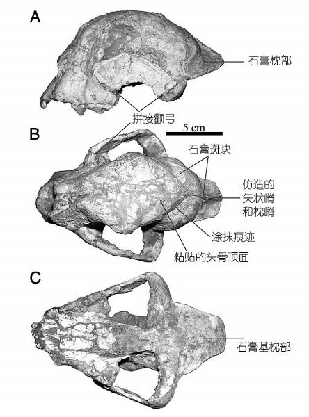 “‘头骨’的照片清晰显示,其侧面的颧弓又高又宽,比实际上猎豹的颧弓宽大多了。更关键的是,这个颧弓后部缺乏猎豹所具有的突出的尖角状眶后突,而且还与头骨有拼接的明显界线。我当时就觉得,这个颧弓肯定是拼出来的,而且还是用某些动物的肋骨化石做上去的。”邓涛指着图片说。