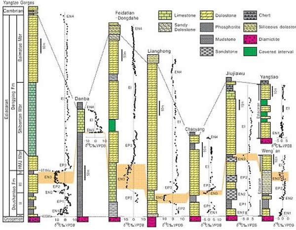 近期,我所王伟博士、周传明研究员等在扬子地台西缘的埃迪卡拉系碳酸盐岩沉积地层开展了高分辨率碳同位素研究,并详细总结了扬子台地中部、东部的同位素研究结果。研究发现最大碳同位素负漂移事件在整个扬子地台可进行精确的对比,表明该时期古海洋碳循环发生了显著的变化。埃迪卡拉纪缺氧的深水盆地有利于溶解性有机碳库的生成,从而打破了地球上正常的碳循环,导致了碳酸盐岩地层中碳同位素组成的异常现象。埃迪卡拉纪中期有机碳库大规模氧化也预示着该时期大气含氧量的增长。研究成果近期发表于Gondwana Research。