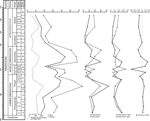 研究发现,在早、中奥陶世,华南牙形类的多样性逐渐增加;其中,在弗洛期及达瑞威尔早期,牙形类主要经历了三次较显著的辐射事件,具有较高的多样性和新生率。研究表明,华南奥陶纪牙形类多样性演变不仅受控于海平面变化,而且与其他环境因素如古气候(变冷)、海水化学性质等密切联系。