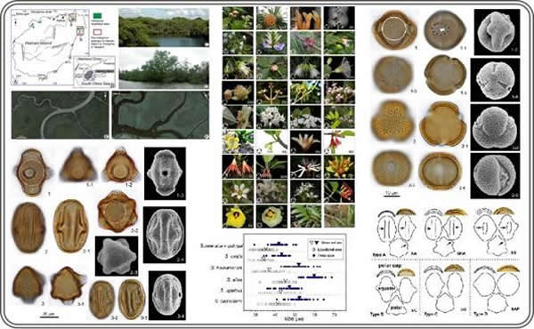 中国科学院南京地质古生物研究所毛礼米博士经过与国内外同行合作,系统研究了约38种在中国分布的红树林及其部分伴生植物的花粉形态特征,根据扫描电镜与光学显微镜观察分析结果,建立了红树林植物花粉形态鉴别的检索表,并针对重要类群的花粉形态特征深入探讨了花粉形态种间识别的可能性与局限性,如红树属(Rhizophora)和海桑属(Sonneratia)。该研究成果是河口海岸和海洋沉积物孢粉分析的必要基础,也是研究红树林古植物地理与系统演化的现代对比信息之一。