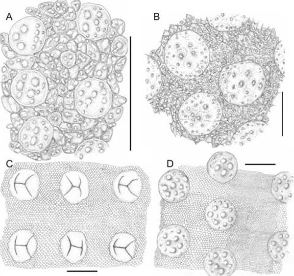 部分新属种表皮装饰复原图:A,Ulexiscolex ormrodi;B,Bullascolex inserere;C,Wernia eximia;D,Radnorscolex bwlchi。比例尺:20微米(A)和40微米(B-D)。