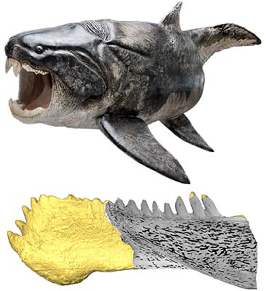 (上)邓氏鱼重塑模型,(下)盾皮鱼下颌的横截面。