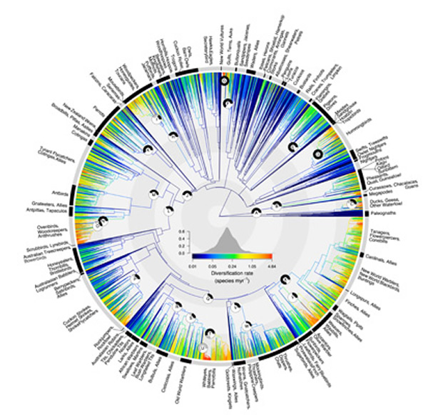 这一新的鸟类家族族谱,如图所示是一个圆圈,它揭示了在过去5000万年期间,这种生有羽毛的生物的多样性增加率。圆的正中央是鸟类的祖先;从中心扩展而出的线条则揭示了新的物种是怎样以及何时出现的。在同心的阴影区域中,每个区域代表了2000万年,同时边缘,以及其密集排列的尖端,则展示了今天的鸟类世界。而那些用颜色编码的线条则指明了新物种在谱系中的出现到底有多快——蓝色代表着最慢的速度,而红色则意味着最快。
