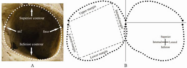 多年来对人类眼眶形状的研究主要采用肉眼观察和测量指数分析两种方法。肉眼观察将眼眶形状分为圆型、椭圆形、方形等不同类型;测量指数通过眼眶宽和高的比来分析眼眶的形状。还有学者将眼眶外轮廓分为若干部分,对每一部分进行观察分析,然后综合起来考虑眼眶形状。由于人类骨性眼眶外轮廓是不规则的,其上、下、内、外各边界并非位于同一平面,且形状的变异是连续的,所以采用这些传统方法观测人类眼眶存在很大的主观性和误差,进而造成对相关研究结果的争议。