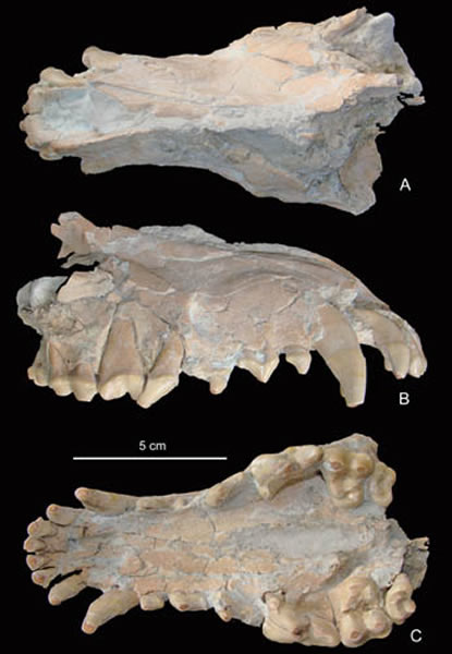 直隶狼上颌骨,A 背视,B侧视,C腹视。(同号文供图)