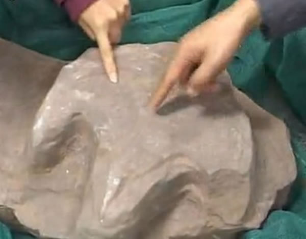 重庆市綦江区工作人员近日在对老瀛山国家地质公园莲花保寨恐龙足迹化石群作保护性开发过程中,在一处石护栏上意外发现了一片大型恐龙足迹化石。