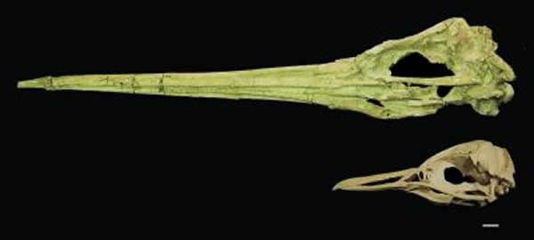 第一个完整的巨型企鹅头盖骨。头盖骨来自秘鲁晚期始新世新物种Icadyptes salasi(估计站立身高为1.5米)。极细的脉管肌理、超长的嘴以及其他特征与任何已知的现存或绝种的企鹅均不同。图中显示当今唯一一种生活在秘鲁的物种Spheniscushumbolti的头盖骨,以显示比例。描述的第二个新物种Icadyptes salasiand使我们对早期企鹅世系的生物地理学和多样性的理解发生了革命性的变化。(比例条 = 1厘米)。