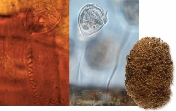 纤毛虫化石和现生纤毛虫,右侧为水蛭的卵茧化石