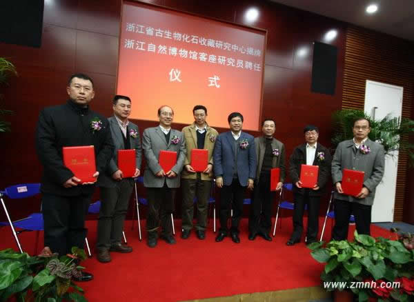 12月18日上午,浙江省古生物化石收藏研究中心挂牌暨浙江自然博物馆客座研究员聘任仪式在浙江自然博物馆四楼科普教室举行。省文化厅厅长金兴盛,省国土资源厅副厅长、党组副书记、巡视员潘圣明,省文化厅副巡视员、省文物局副局长陈官忠,省文化厅人事处处长朱海闵以及中国科学院院士周忠和、中国地质科学院研究员季强等参加了挂牌仪式。金兴盛厅长为客座研究员颁发了聘书,潘圣明副厅长、陈官忠副局长为浙江省古生物化石收藏研究中心成立揭牌。浙江自然博物馆志愿者、博物馆之友、古生物爱好者,以及新闻界的朋友们等参加了仪式。揭牌仪式由浙江自然博物馆馆长严洪明主持。