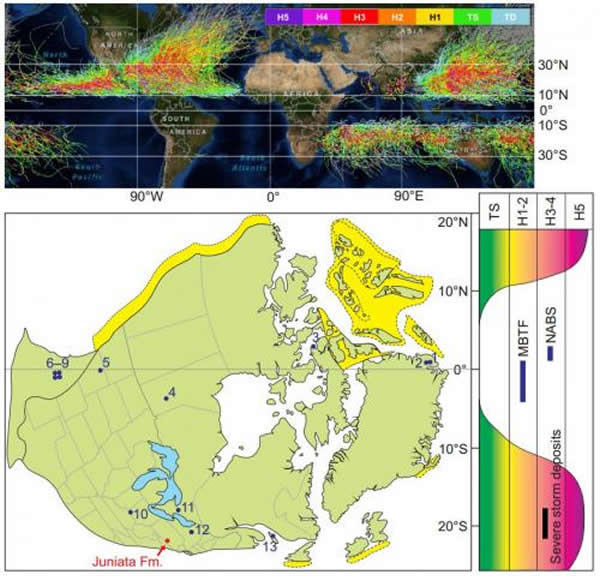 飓风发生率统计图,表明赤道区域发生频率低(上图)4.5亿年前的大陆推测地图