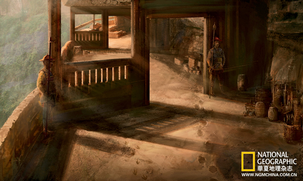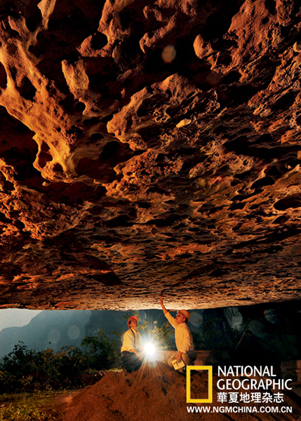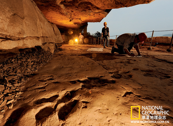 重庆綦江老瀛山,绝壁上的莲花保寨,地面之上,鸭嘴龙类恐龙留下的足迹形成一道完美的行迹,科研人员正在测量和记录这些远古的记忆。