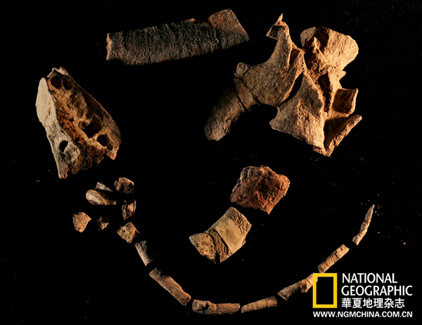 蜥脚类(sauropods)恐龙零散的骨头,大部分是肋骨和脉弧。这只綦江恐龙只保留了脊椎序列,以及不完整的头骨,却没有任何四肢骨,这个有趣的埋藏现象令古生物学家困惑不已。
