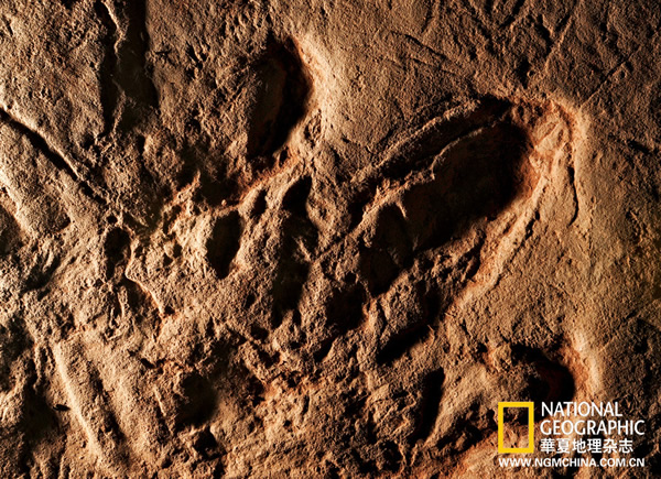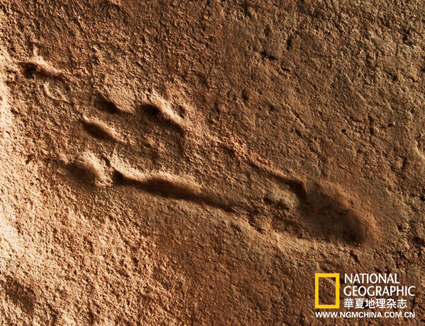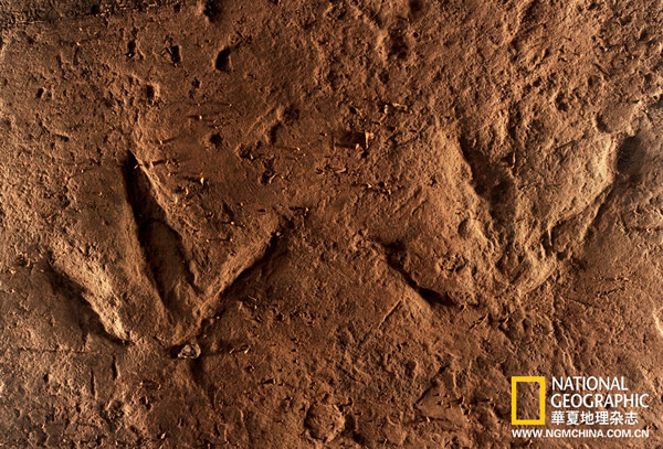 翼龙类后足迹。古生物学家难以根据足迹来判断其主人到底属于哪种具体的恐龙,但因为不同大类的恐龙,其足部骨骼结构有着很大的差异,这些独有的也正总会反映到足迹的形状上。
