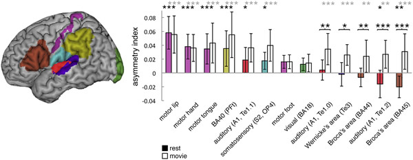Anne-Lise Giraud及其同事把脑电图(EEG) 和功能磁共振成像(fMRI)结合起来,从而监测了16位人类受试者在静息或观看视频的时候的大脑活动。与收听音节、基本感觉处理、口和手的运动有关的大脑区域在观看视频和静息的时候都表现出了左脑支配的说话的典型活动模式。这组作者说,这些结果提示这些区域在硬件上是不对称的,而且可能形成了现代人类的左脑支配的说话和语言的基础。