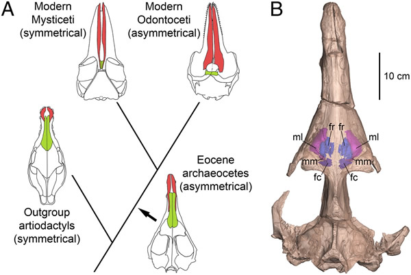 Julia Fahlke及其同事研究了最古老的鲸(古鲸archaeocete)的6个化石颅骨,这些鲸被认为在大约3400万年前进化成了所有种类的现代鲸。这组作者测量了这些颅骨的中线——成对的骨沿着中线形成了整个颅骨的边和顶部——偏离从口鼻部尖端到头的后部的直轴多远。所有这6个颅骨都偏向了左侧,尽管不对称的程度各有差异,这6个化石中的4个的中线偏离轴的程度比预计的远远更大。