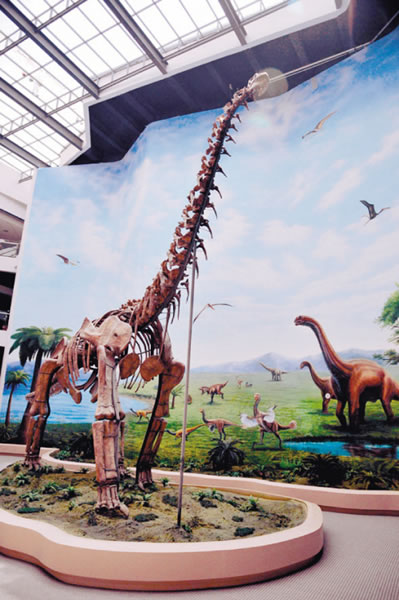 该化石是沈师2007年采集而来的,基本上保存了它的全部骨骼。为了让参观者看见珍品,巨龙四周的玻璃罩下,陈列着它的各部位骨骼。最珍贵的是,这条巨龙保存了完整的头骨,也陈列在展厅里,参观者不容错过。