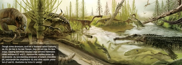 和恐龙祖先一起成为三叠纪幸运儿的,还有现生蜥蜴、两栖动物和火蜥蜴的祖先们,它们甚至比当时的恐龙祖先更有优势。如果你在三叠纪,将会看到成群的外型像鳄鱼的鳄踝初龙(crurotarsans),而不是恐龙。