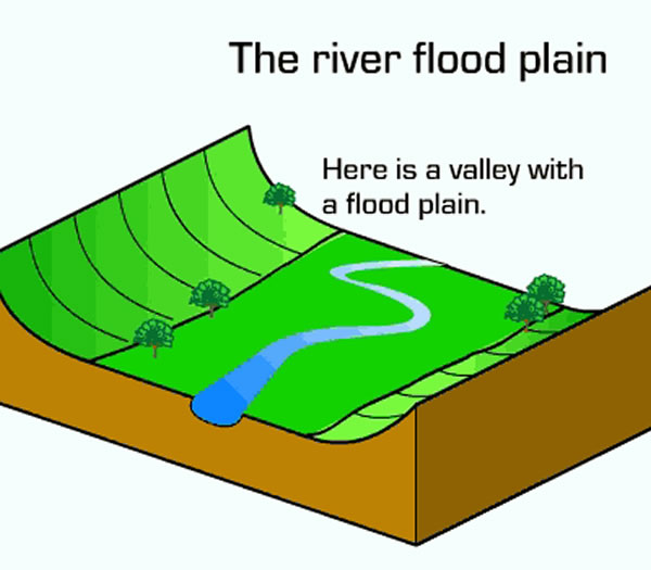 河流洪水期淹没的河床以外的谷底部分。它由河流的横向迁移和洪水漫堤的沉积作用形成。平原区的河漫滩比较发育。由于横向环流作用,V 字形河谷展宽,冲积物组成浅滩,浅滩加宽,枯水期大片露出水面成为雏形河漫滩。之后洪水携带的物质不断沉积,形成河漫滩。河漫滩沉积大多具二元结构,下部是河床相沉积,上部为河漫滩相沉积。河漫滩的主要类型有:①河曲型河漫滩,发育于弯曲型河段。常在凸岸堆积为滨河床沙坝、迂回扇等。②汊道型河漫滩,为在汊道型河段中形成的浅滩及其附属的沙坝、沙嘴等。③堰堤型河漫滩,发育于较直型河段,形成天然堤。④平行鬃岗型河漫滩,为堰堤型河漫滩与河曲型或汊道型河漫滩的过渡类型,表现为一系列平行鬃岗系统,鬃岗之间为浅沟、洼地或湖泊。