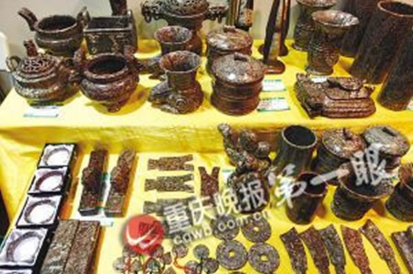重庆晚报记者在市工艺美术行业协会的展厅看到,用海洋生物化石为原材料加工而成的工艺品有十余款,如文房四宝、手镯、香炉、茶具、古钱币等。协会副会长何发美称:“尽量的原汁原味,是这类工艺品最大的卖相。”