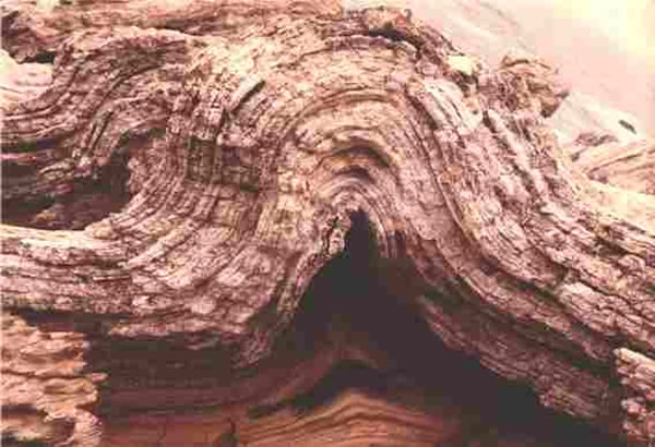 褶皱的形成机制与受力方式、变形环境和褶皱层的力学性质有关,大致有以下 4种作用:① 纵弯褶皱作用。受顺层水平挤压力的作用产生的褶皱,通常为等厚褶皱,形成于较浅层次的上部地壳中,强度较大的褶皱层起主导作用,但各层的强度可以有较大差别。②横弯褶皱作用。受垂直于褶皱层的力的作用产生的褶皱,通常为顶薄褶皱。③剪切褶皱作用。受斜交于褶皱层的一系列平行密集面的不均匀剪切作用产生的褶皱,通常为顶厚褶皱,常发生在中层次(或深层次)韧性较大下部地壳岩石中。④流褶皱作用。形成于塑性较大的岩石中(如岩盐、石膏)或处于地壳深处高温、高压环境下低粘度固态物质中,常产生具流动变形特点的形态复杂的柔流褶皱。
