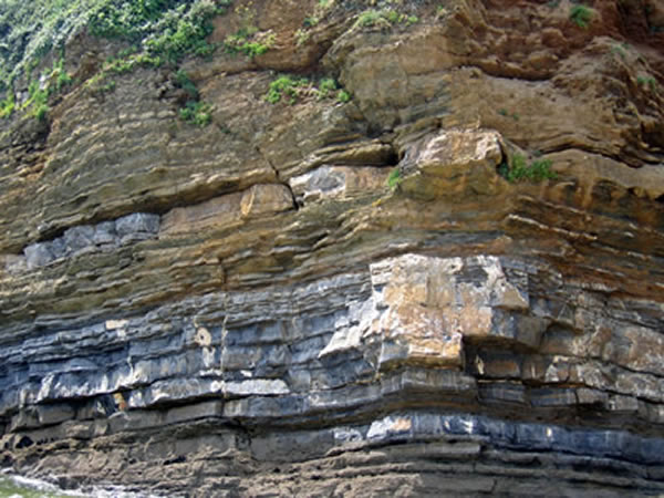 沉积岩具有特征性的化学成分、矿物成分和结构构造 。由于沉积分异作用的原因,不同类型沉积岩石的化学成分差别很大,如碳酸盐岩以钙镁氧化物和CO2为主,砂岩以SiO2为主,泥岩则以铝硅酸盐为主。在矿物成分方面,岩浆岩中常见的铁镁矿物在沉积岩中少见,沉积岩中常见的盐类矿物和粘土矿物在岩浆岩中不存在或罕见。在结构构造方面,沉积岩具有独特的碎屑结构,泥状结构,层理层面构造和发育的孔隙为岩浆岩所没有。含有生物化石也是沉积岩的特征。