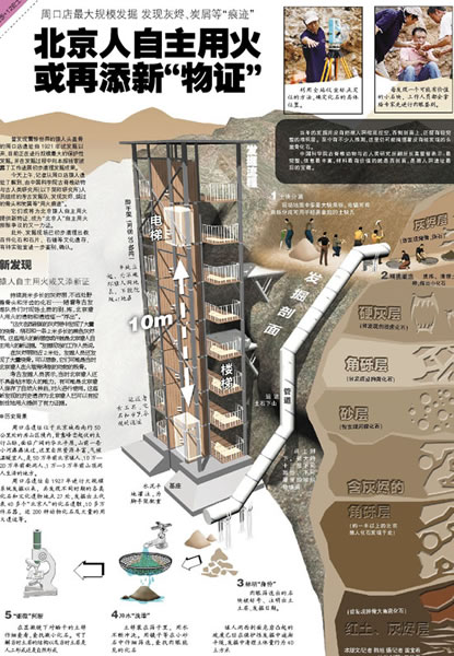 持续两米多长的灰烬带、不远处野兽骨头和牙齿的化石……随着考古发掘队员们对现场土质的剥、拣,北京猿人用火的遗物和遗迹逐一“浮出”。“这次在西剖面的灰烬层中发现了大量的烧骨、烧石和一条2米多长的黑色灰烬带。这些用火的新痕迹或许就是北京猿人自主用火的新证据。”发掘现场的工作人员说。
