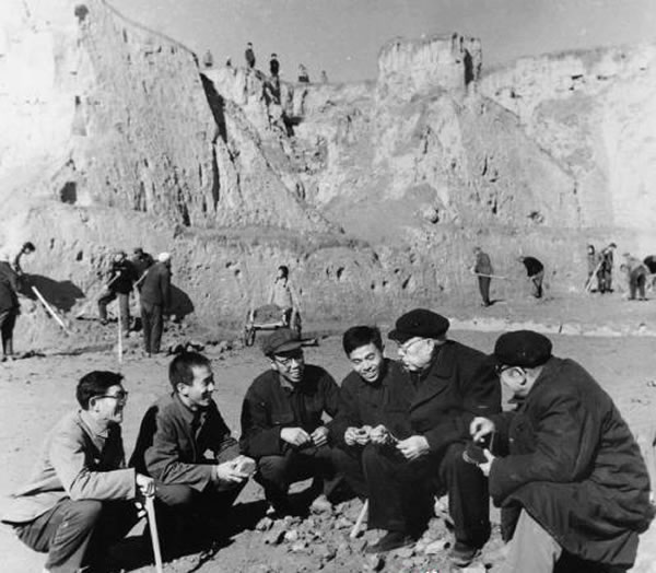 1977年10月30日卫奇(左三)和杨钟健、贾兰坡等人在许家窑